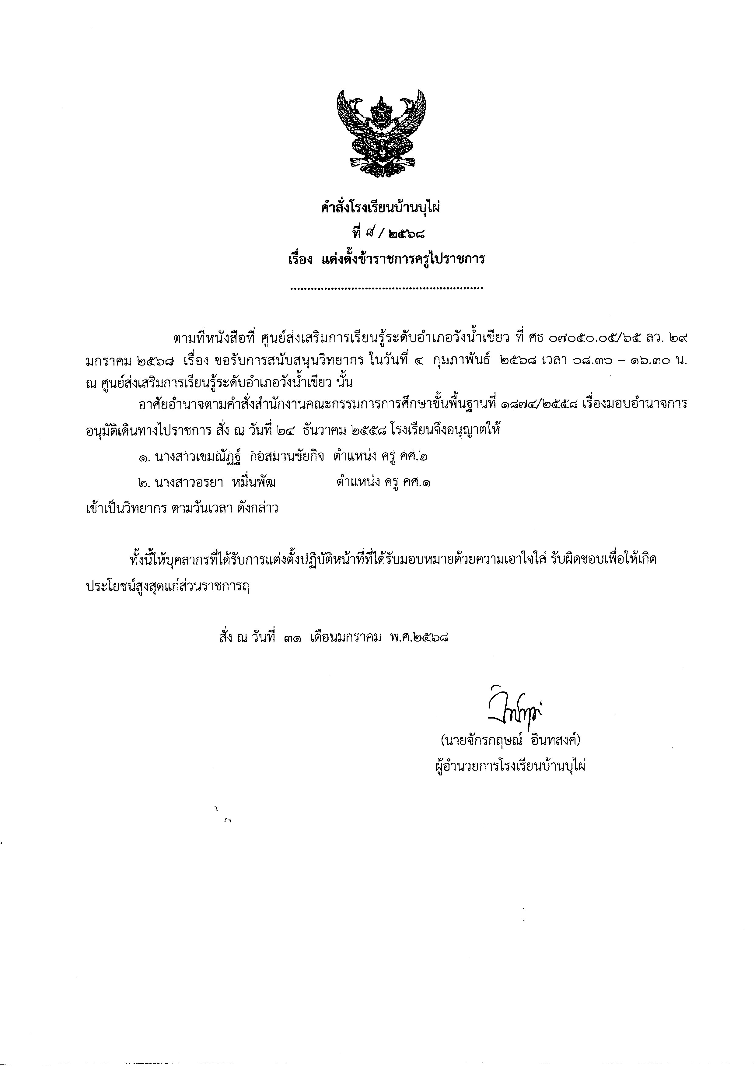 | คำสั่งเเต่งตั้งข้าราชการครูไปราชการ ในวันที่ 19-2-69 ณ โรงเรียนวังน้ำเขียวพิทยาคม |